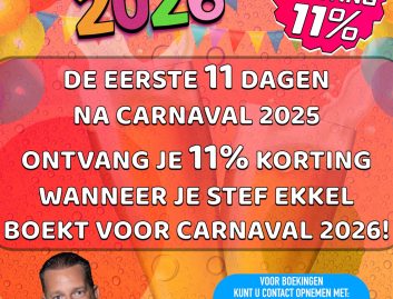 Speciaal voor alle boekers heeft Stef Ekkel een geweldige leuke actie bedacht, want de eerste 11 dagen na Carnaval 2025 ontvang je 11% korting wanneer je Stef Ekkel boekt voor Carnaval 2026! Deze actie loopt van 5 maart t/m 15 maart 2025.