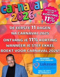 Speciaal voor alle boekers heeft Stef Ekkel een geweldige leuke actie bedacht, want de eerste 11 dagen na Carnaval 2025 ontvang je 11% korting wanneer je Stef Ekkel boekt voor Carnaval 2026! Deze actie loopt van 5 maart t/m 15 maart 2025.